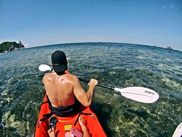 Kayak day in Koh Tao! 今天划獨木舟出海探險,當然大部分都是前頭那位先生在划​ 海好乾淨好漂亮! 我迫不及待跳下海浮潛,結果踩到海參忽然覺得很噁心,腳還用力的踢了一下珊瑚然後被劃破一小道,老皮說他大老遠就聽到我在海裡亂叫,看來我還是乖乖待在船上好了。