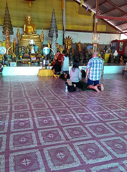 這是普吉島大佛下的僧人祈福儀式,要從跪墊那一路跪到大師面前,然後大師會口唸咒語,在你手腕綁上幸運繩,再灑聖水在你身上。來這祈福的人以白人居多,兩個白人老頭旁邊都帶著年輕泰妹,不過不知道是年紀大了膝蓋不好彎,還是這輩子沒跟人跪過,比起旁邊卑躬屈膝的泰妹們,他們跪的好像不太情願啊,其中一個還偷偷爬起來用走的過墊子......