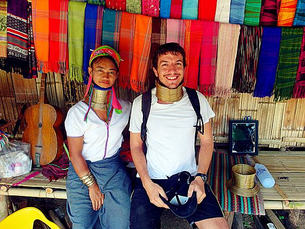這是清邁附近的凱倫部落,裡面住著從緬甸來的長頸族,女生從四歲開始戴上脖子鐵環,每次一有空位就再加一圈,他們覺得脖子越長越美。