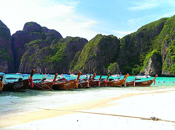 今天終於出海了,搭著傳統的泰式長尾船尋找李奧納多,結果沒找到(廢話)。Maya Bay因為李奧納多2000年左右的the beach這部描寫背包客的電影而一路紅到現在,每天擠滿了世界各地慕名而來朝聖的觀光客。大部分的人潮都集中在中午,我們因為是下午的行程所以幸運的可以看到沒那麼多人的海灘。之後又是不斷浮潛,我因為吞了兩顆暈船藥而在船上睡死...可惡泰國的爛暈船藥根本是安眠藥嘛​。在大披披島買小披披島的環島行程,下午一點半到日落,350泰銖+100泰銖入場費,含蛙鏡、水、西瓜跟炒飯。